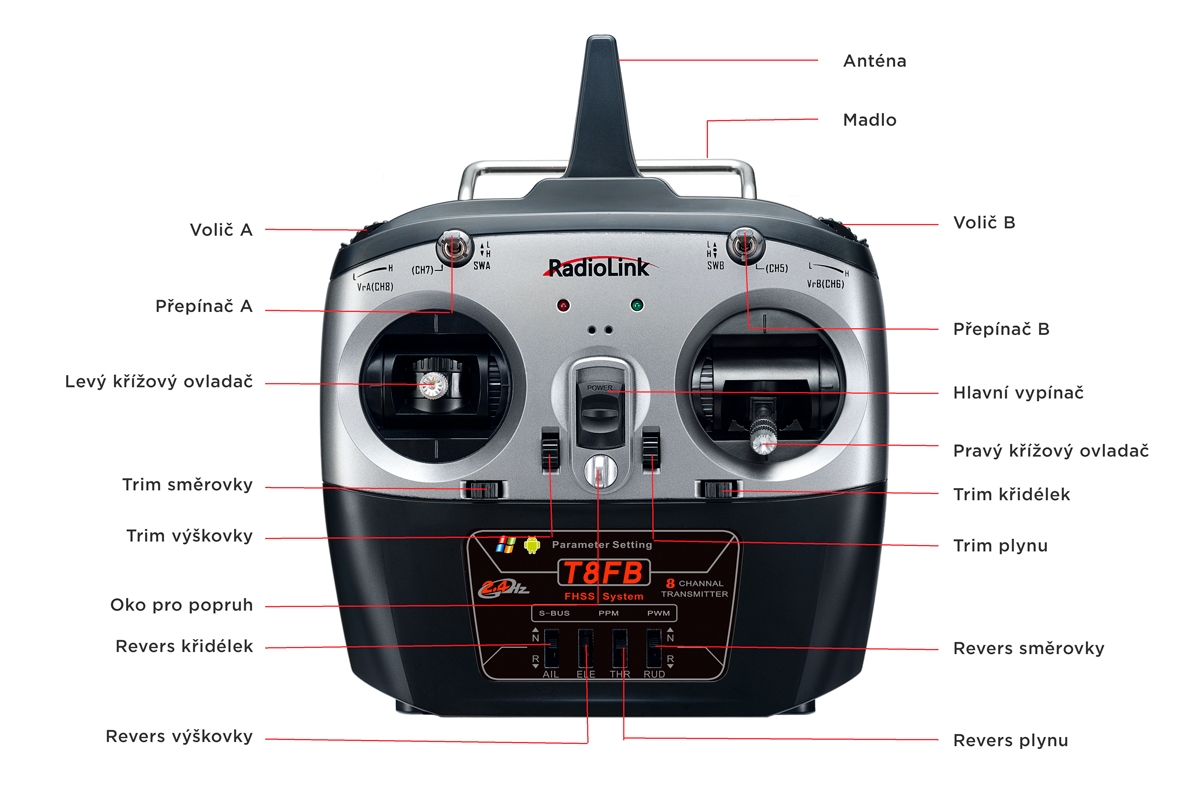 Tip: Vysílač T8FB je dodáván s ovladači v módu 2. Dáváte-li přednost módu 1, vysílač si můžete snadno upravit s pomocí našeho video návodu.