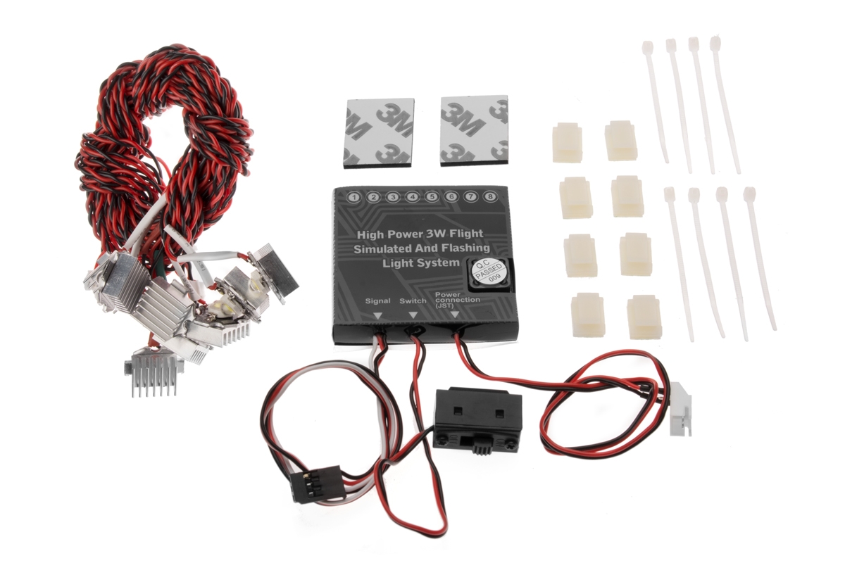 Sada světel s 5mm LED s extra vysokou svítivostí pro RC modely letadel, vrtulníků a multikoptér použitelná i pro lodě; celkem 3W. V základním nastavení simuluje činnost pozičních, antikolizních a přistávacích světel skutečných letadel a vrtulníků – dává tak RC modelu realističtější vzhled. Obsahuje 8 LED světel s extrémně vysokou svítivostí: antikolizní blikající červený maják, 3 bílé zábleskové majáky, červené a zelené poziční světlo, 2 bílá přistávací světla.