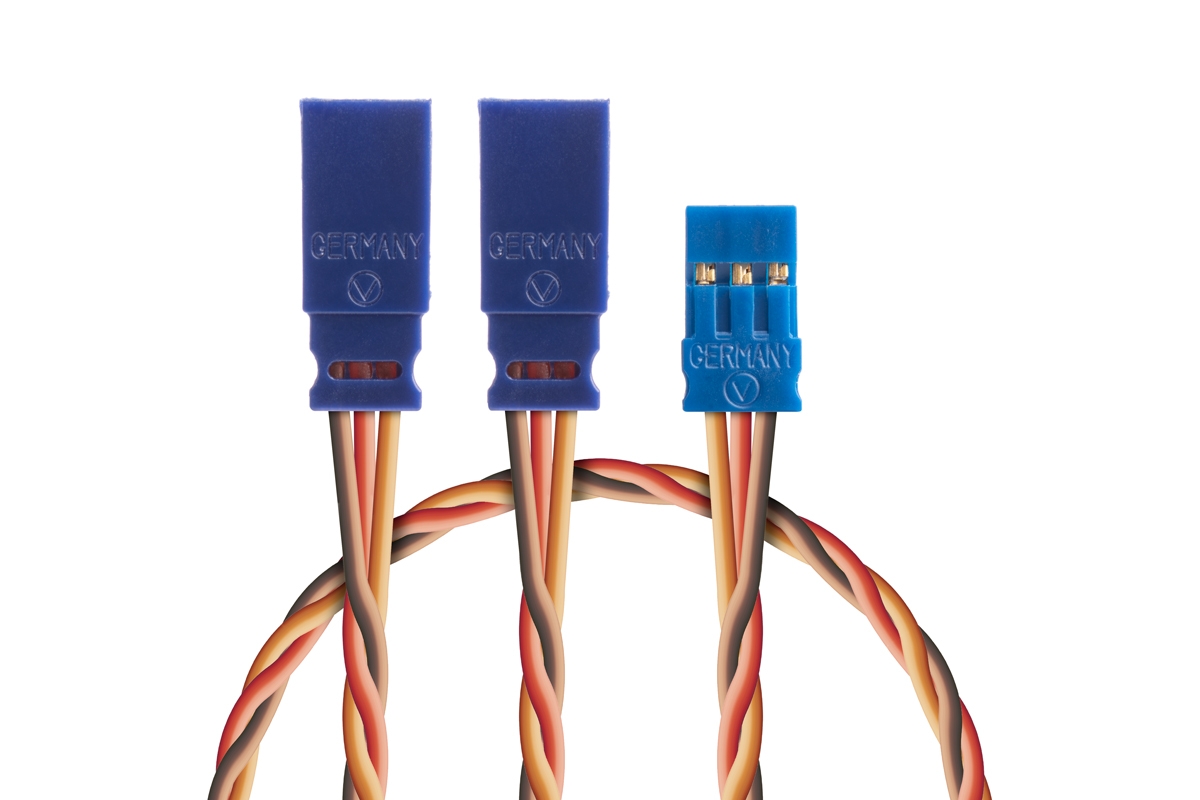 Kroucený velmi silný Y-kabel dlouhý s konektory JR o délce 300 mm se silikonovou izolací, průřez vodičů 0,35 mm2. Vyrobeno v Německu.