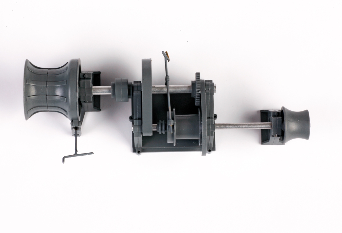 Nefunkční maketa kotevního a záchranného navijáku. Rozměry: 123x43x35mm.